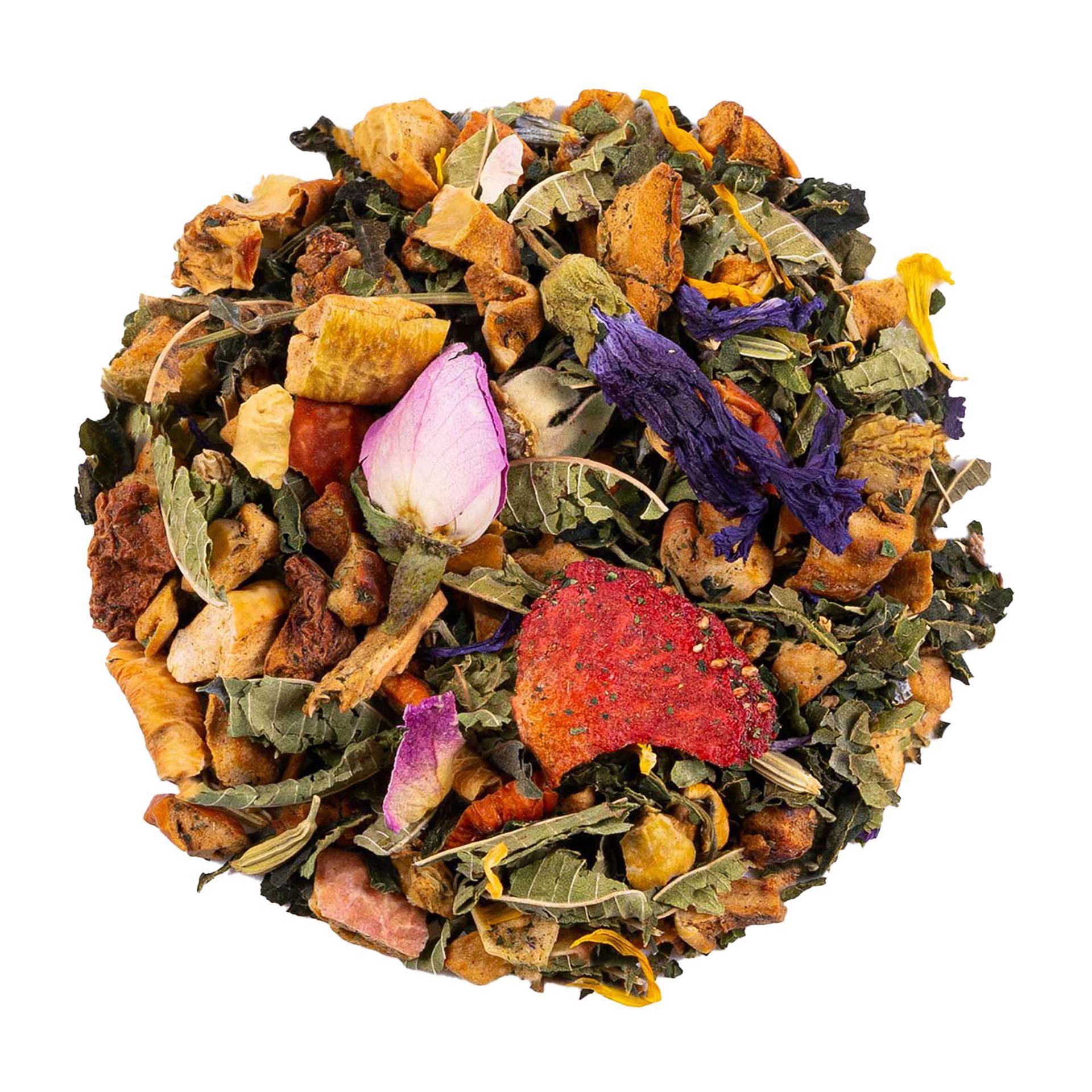 Apfel, Brennnessel, Verbene ganz, Fenchel, Ringelblumen, Rosenknospen rosa, Lavendel, Erdbeere, Malve, Basilikum, Rosmarin, Thymian
